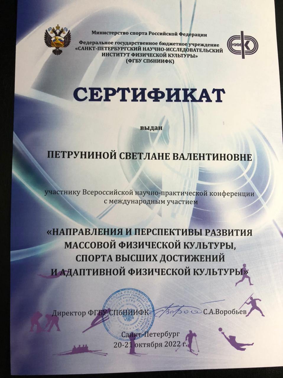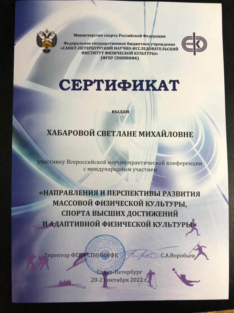 20-21 октября 2022 года в г. Санкт-Петербург к.п.н., доценты кафедры "Физическое воспитание" Светлана Валентиновна Петрунина и Светлана Михайловна Хабарова приняли участие во Всероссийской научно-практической конференции с международным участием, которая состоялась в Санкт-Петербургском научно-исследовательском институте физической культуры.